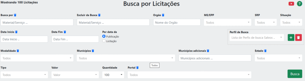 Contando com diversos filtros, você terá acesso a um sistema de busca de licitações e dispensas de licitações para encontrar as melhores oportunidades do dia para sua empresa de acordo com sua necessidade. Adicione e exclua palavras-chave que não deseja receber, monte perfis de busca para não ter que preencher os filtros toda vez que for fazer uma nova captura e muito mais.