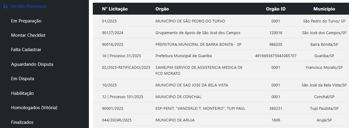 Saiba exatamente em qual etapa está cada uma das licitações que está, ou pretende participar, e desta forma otimize sua rotina, ganhe tempo e eficiência aumentando suas participações e faturamento.